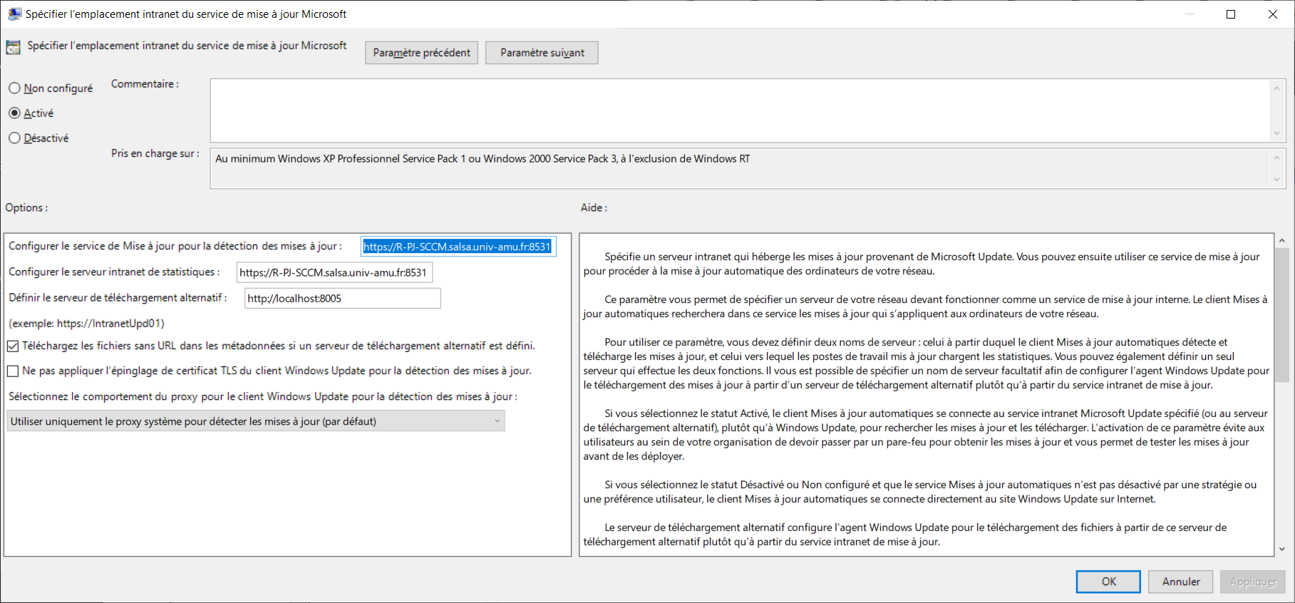 …. Windows Update : - Spécifier l’emplacement intranet du service de mise à jour Microsoft => NON Configuré