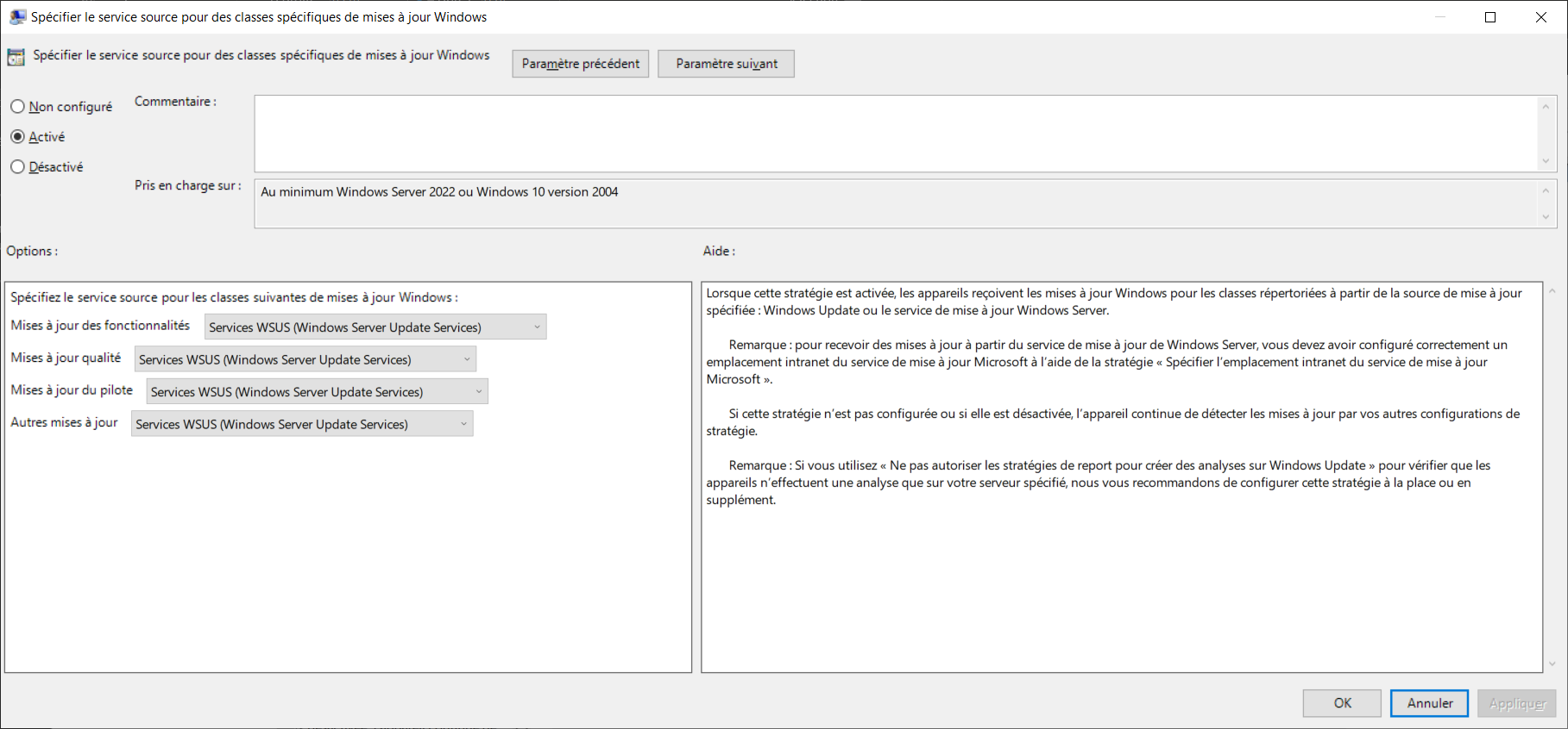 • Spécifier le service source pour les classes spécifiques de mises à jour Windows => NON configuré