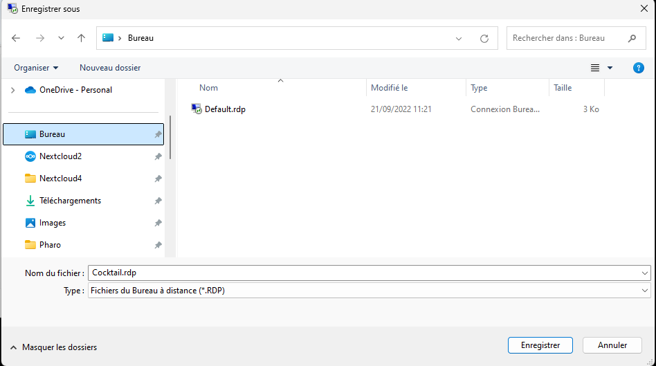 Créer le raccourci en le mettant sur le Bureau et le nommer : Cocktail.rdp