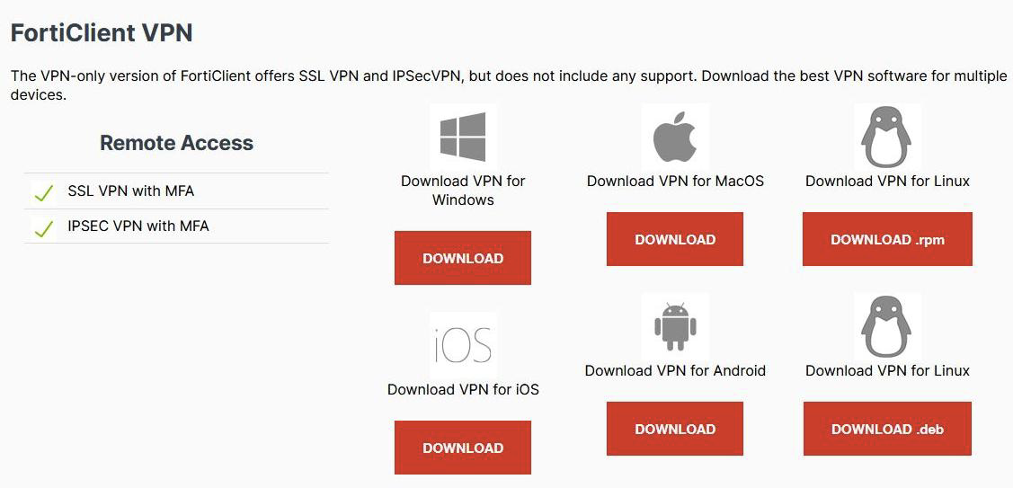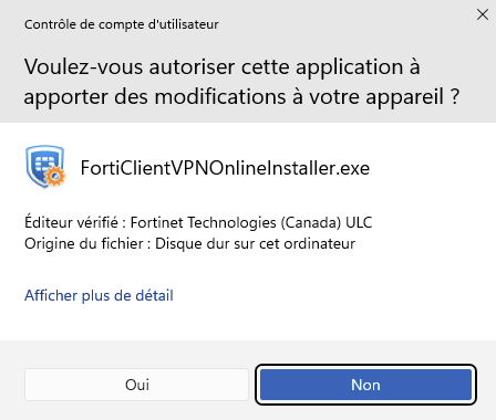 avoir téléchargé la version du programme « Forticlient VPN Only » depuis le site officiel de Fortinet : https://www.fortinet.com/support/product-downloads#vpn .